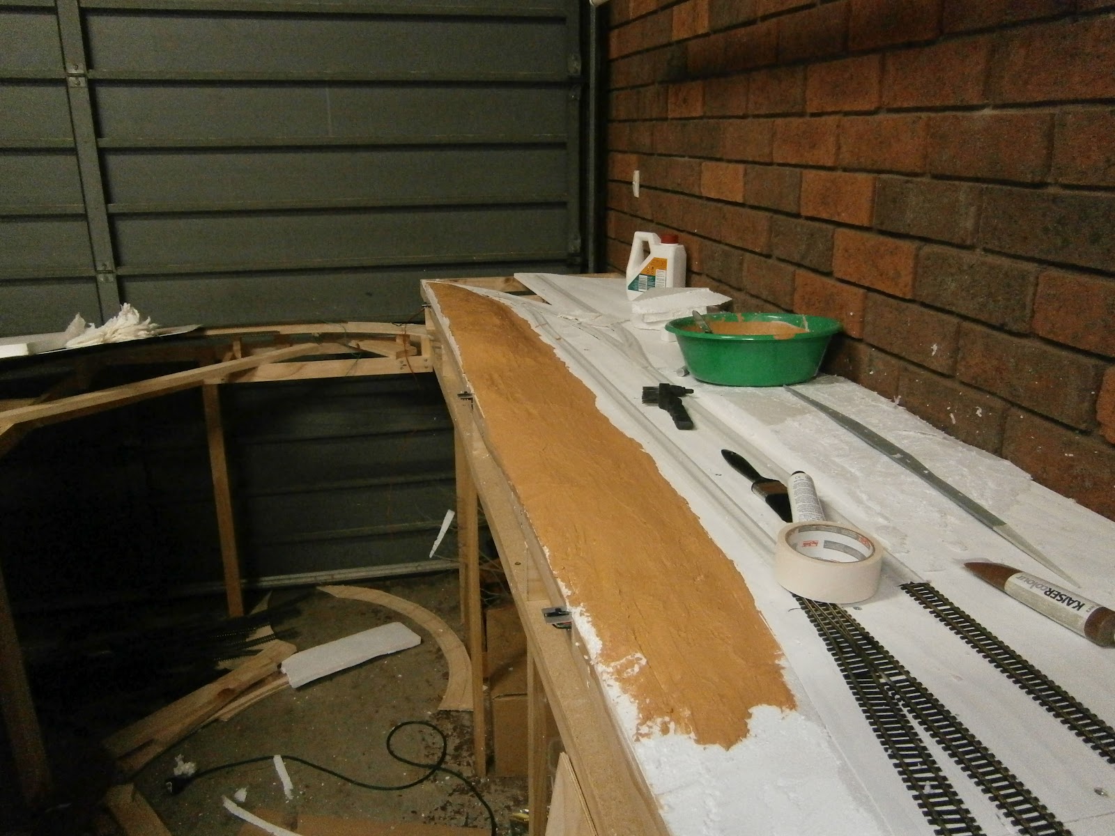 Well after the last post showing the trackwork its time to show the progress of this section of the layout.The polystyrene foam was glued down & shaped with a sharp knife and what a mess this makes as we all know.Next after i was happy with the basic shape i cover the foam with plaster with brick oxide mixed in to take away the white look and also as a base colour.I start out with the mix fairly thin and brush it on,then as it starts to go off i shape by hand,laytex gloves and a bowl of water helps with this part.I also cover the trackwork with masking tape.After the plaster has set(seams to take for ever in this cold weather)i start to add the ground cover,dirt i have gathered from various places is seived to use as the base,then sprinklings of woodlands fine turf in different colours,add a bit of course turf,then its time for the static grass,here i have used different brands & colours.I made an aplicator for the static grass from some instructions that Gary at Model Railroad Craftsman gave me on a visit.For all of about $40 it sure beats the price of buying one.Anyhow a picture says a thousand words as they say,so here are some.